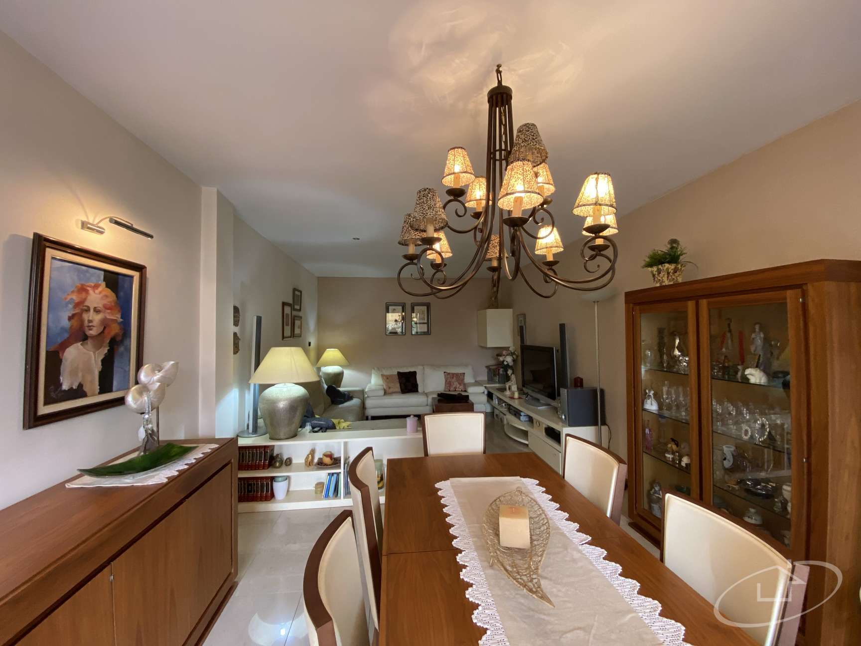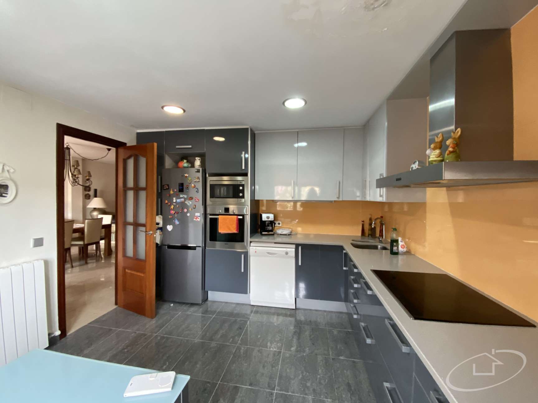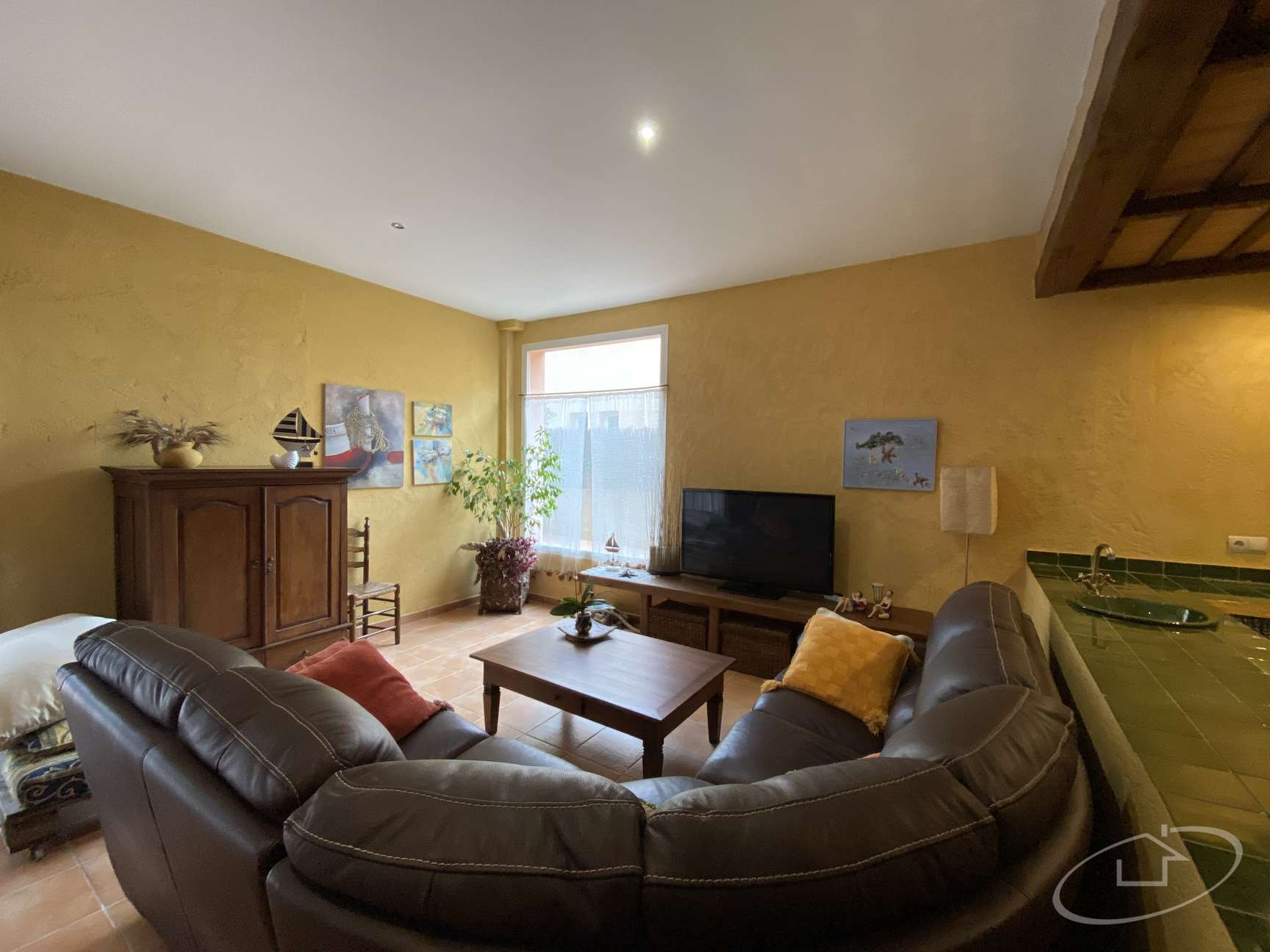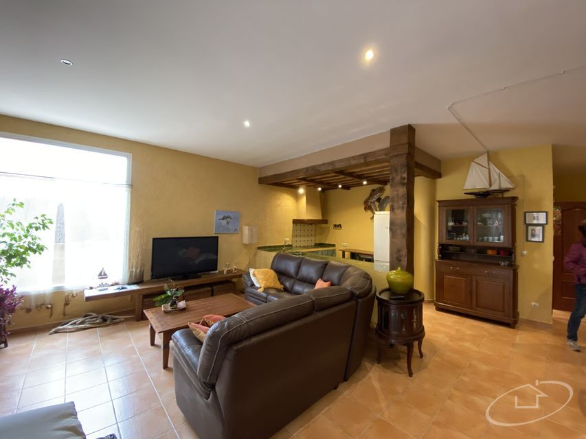 Rez-de-chaussée avec grand salon avec accès au jardin, cuisine ouverte, une chambre double, 1 salle de bain et une buanderie avec salle des machines
