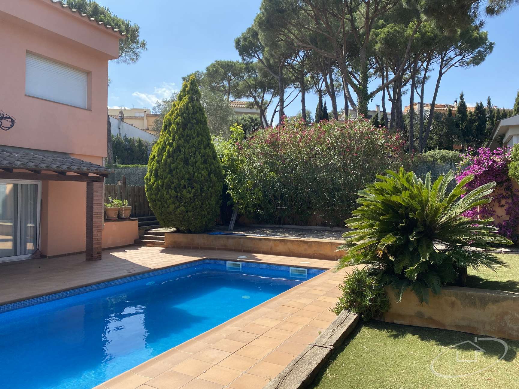 Grand jardin avec piscine et véranda extérieure pour 1 voiture.