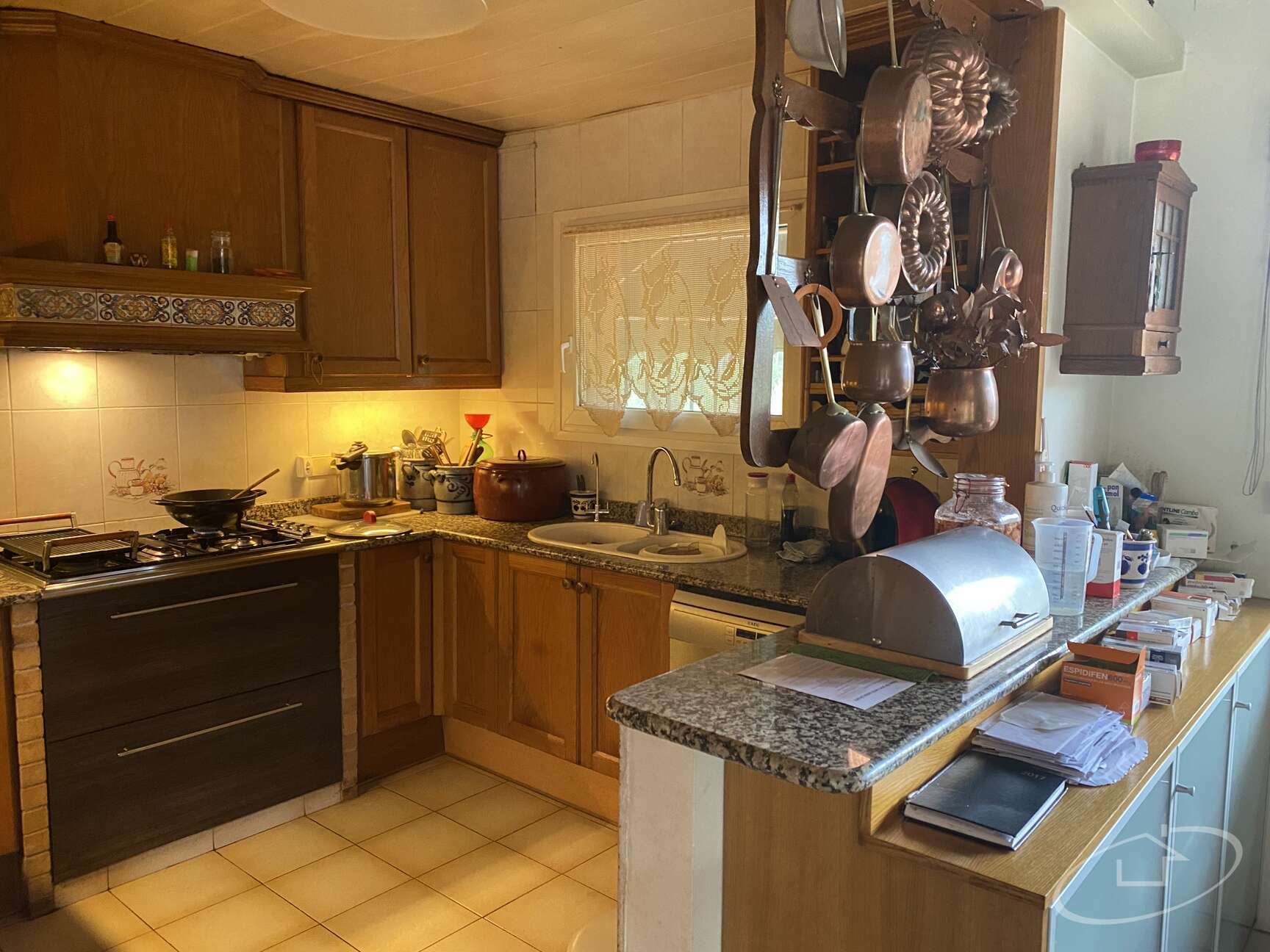 La maison est répartie sur deux étages, au premier étage il y a un hall d'entrée, une cuisine, un salon avec accès à la grande terrasse et une salle de bain. Il y a aussi un porche barbecue à cet étage. Il y a aussi un garage pour 3 voitures.