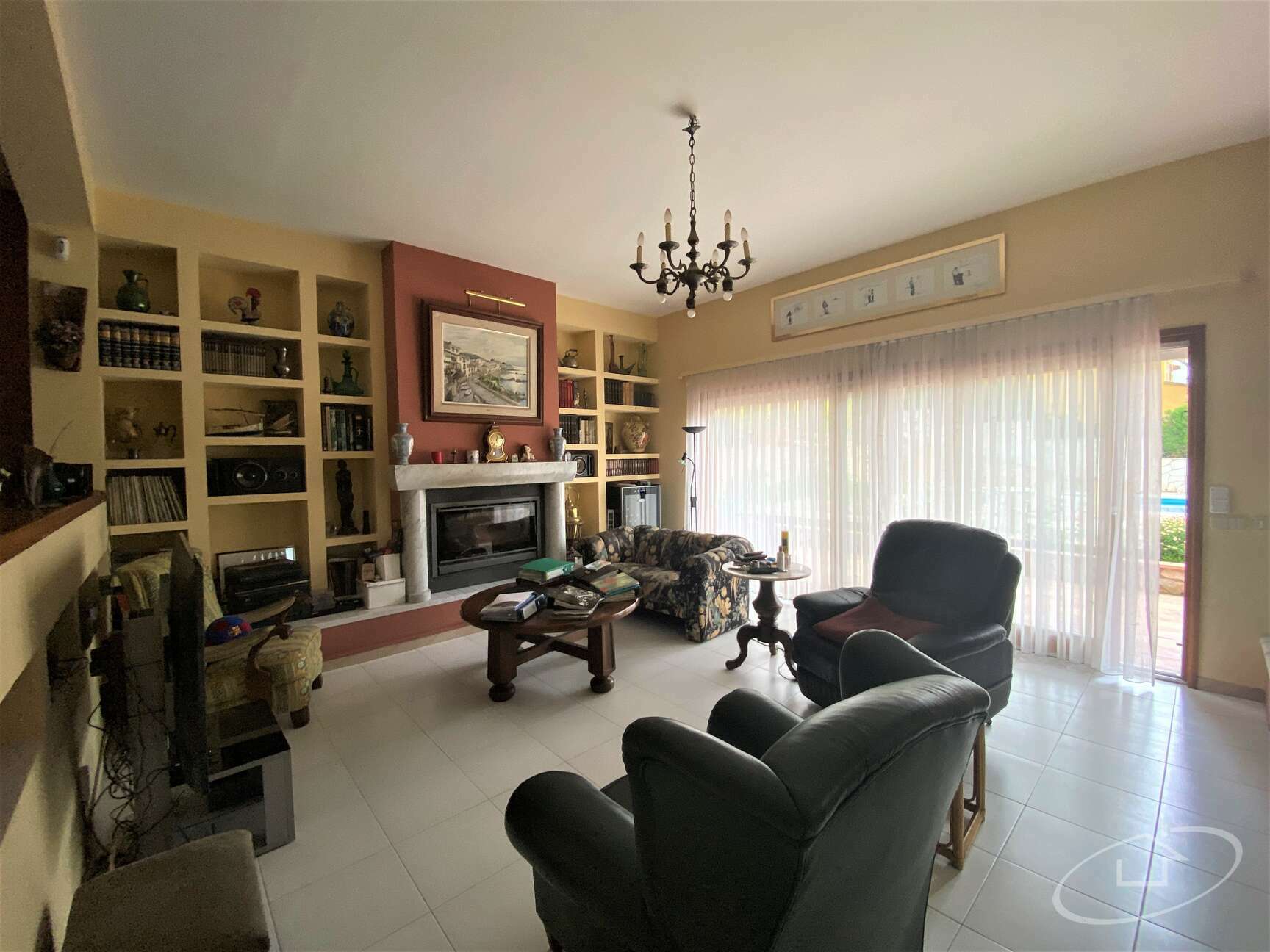 La maison est répartie sur deux étages, au premier étage il y a un hall d'entrée, une cuisine, un salon avec accès à la grande terrasse et une salle de bain. Il y a aussi un porche barbecue à cet étage. Il y a aussi un garage pour 3 voitures.